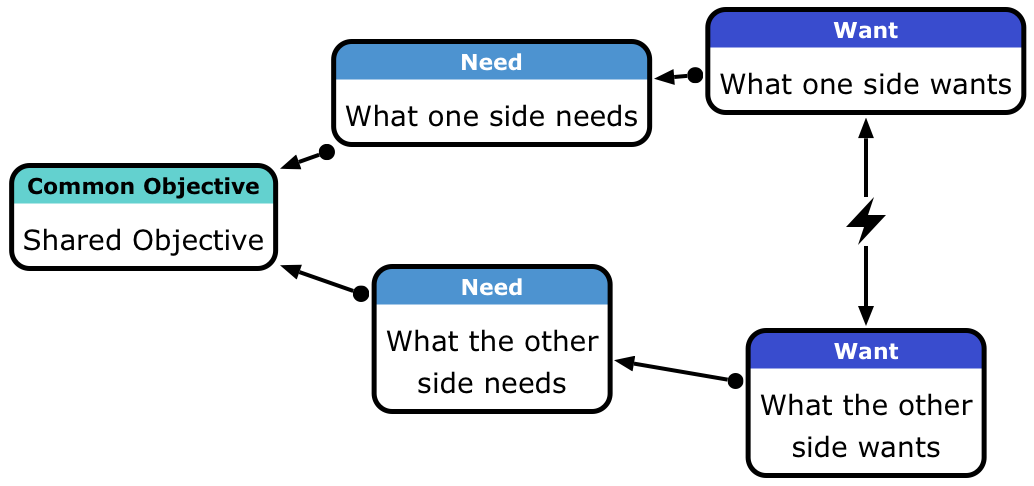 - As long as two people/groups have the same goal, there cannot be a situation where an unresolvable conflict occurs. If you do not share the same purpose, a dispute will typically not be resolved. However, in most cases, it will be possible to find a shared goal if you look at the goals beyond the goal. So, instead of "Marketing needs a budget of XUSD", you go to the next level and agree that you want the best for the Marketing department (the budget was only a way to achieve this goal), or even what is the best for the company as a whole.
