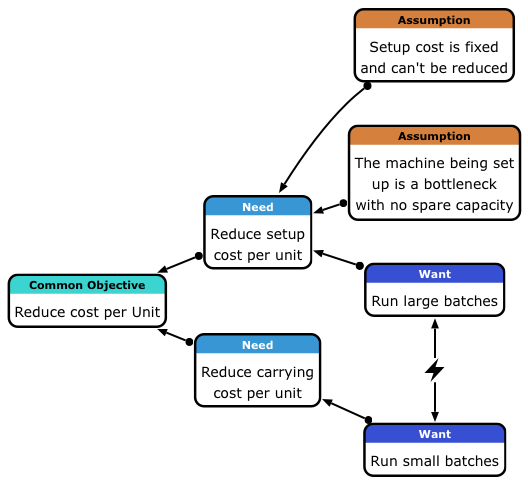 These assumptions are easier to find when the diagram is verbalised by stating each connection even aloud by constructing "In order to... we must ...". So, the assumptions here violate the phrase "In order to reduce setup cost per unit, we must run large batches." Notice the wording "we must". It invites critics.